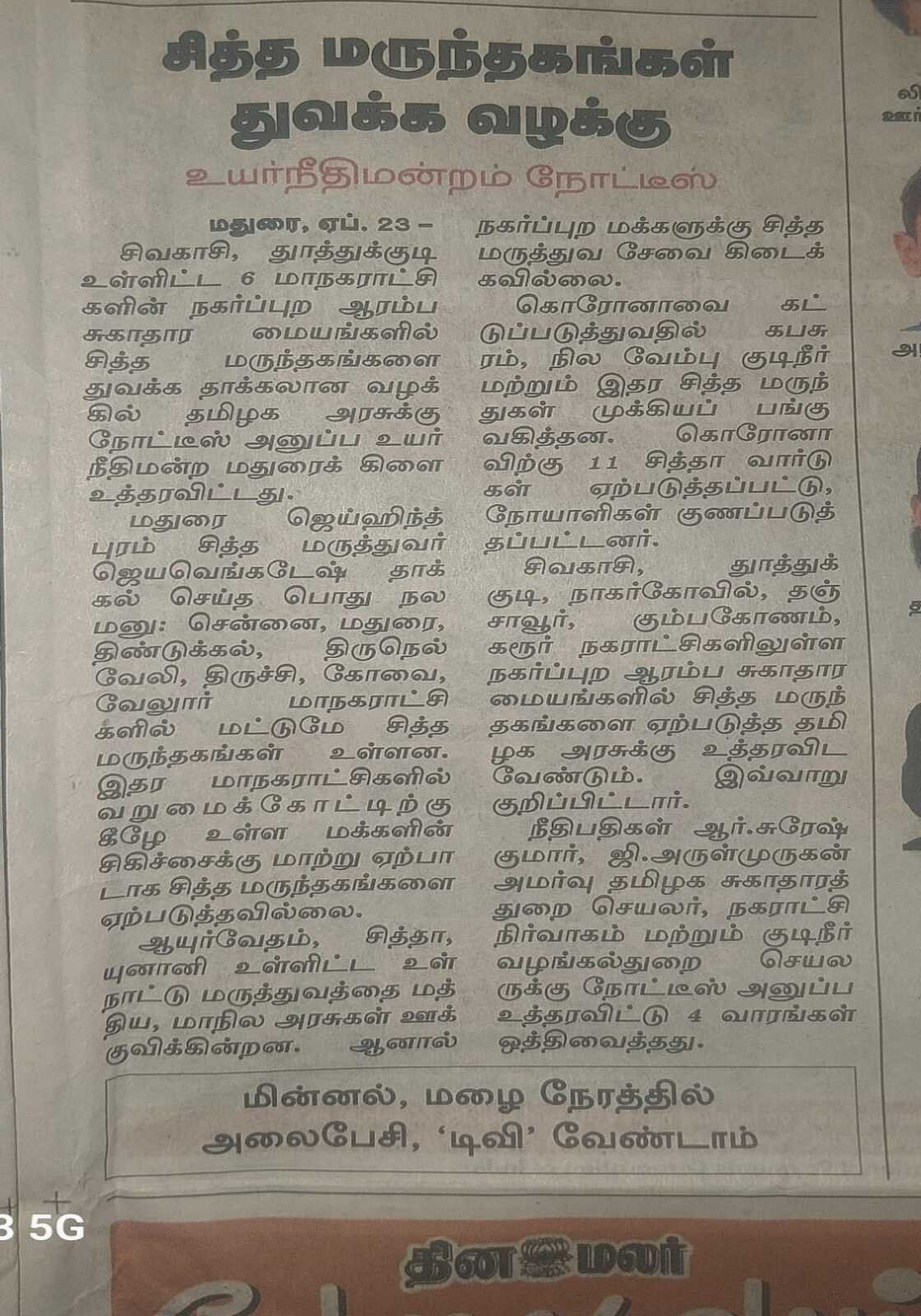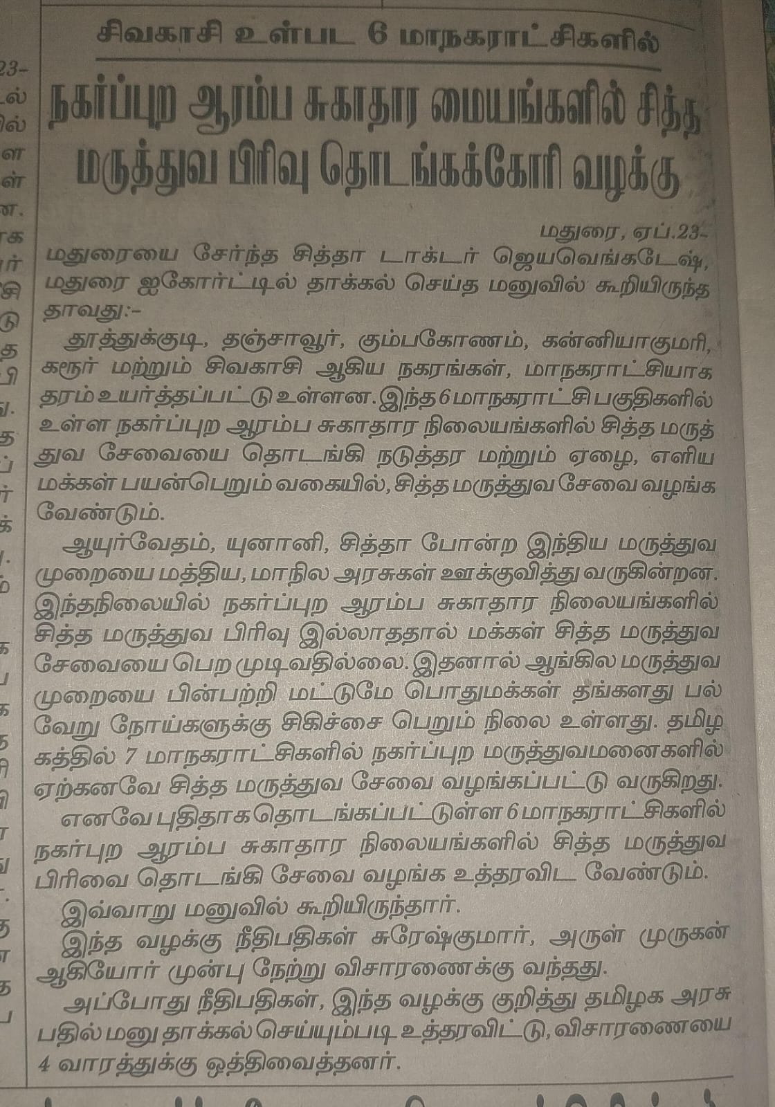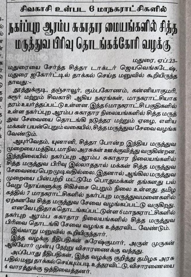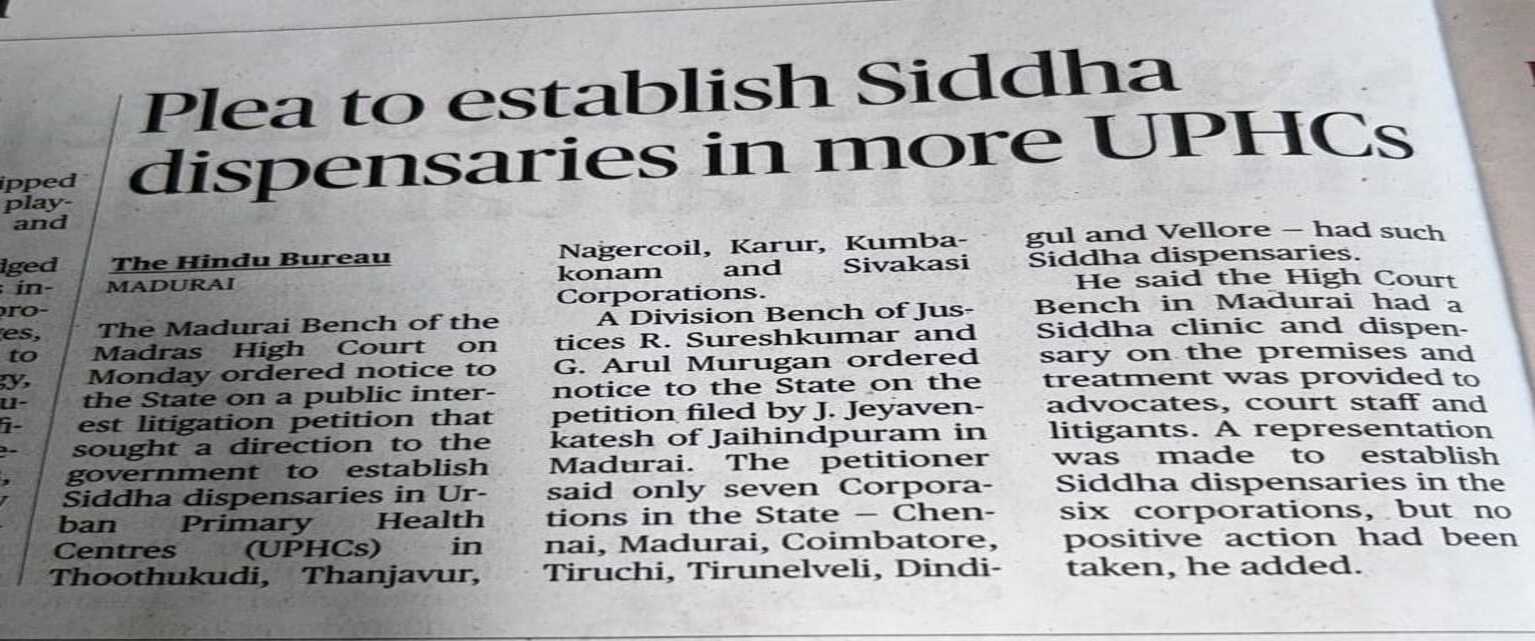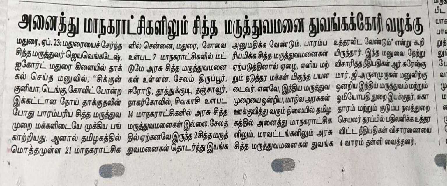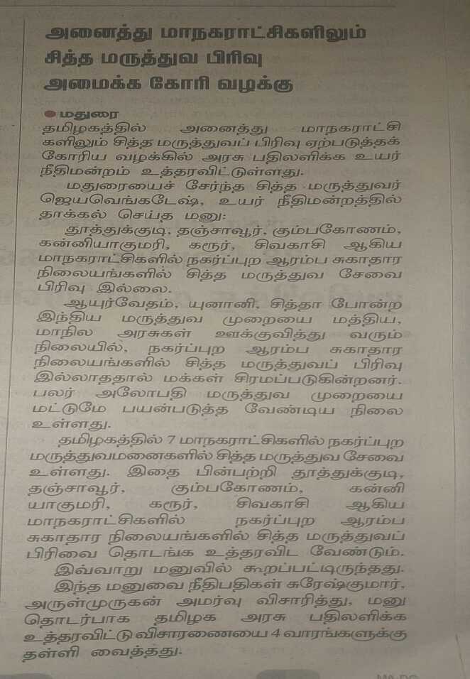 Plea to start Siddha medical centers in all Corporations of Tamilnadu state